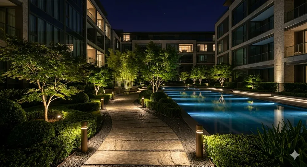 하이엔드 주거의 진정한 가치는 단지 내부의 조경 공간에서 증명됩니다. 입주민들이 집으로 돌아오는 길, 혹은 저녁 산책을 즐기는 공간은 마치 5성급 호텔의 리조트와 같은 감동을 주어야 합니다. 조경 조명 설계의 핵심은 시선이 머무는 곳에 감성적 포인트를 배치하고, 보행자의 동선을 안전하고 유도미 있게 이끄는 것입니다.