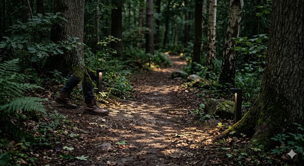 먼저, 보행로를 안내하는 낮은 높이의 볼라드 조명은 시각적 유도성(Lead)을 확보하되 눈부심(Glare)을 최소화해야 합니다. 여기에 수목의 하단부에서 상단으로 쏘아 올리는 업라이팅(Up-lighting)을 결합하면 숲의 깊이감이 살아나며, 이는 보행자에게 공간에 대한 장악력과 심리적 안전감을 부여합니다. 특히 연색성(CRI)이 90Ra 이상인 고품질 LED를 사용하면 야간에도 식물 고유의 초록색이 생생하게 살아나는데, 이는 비오필릭 디자인(Biophilic Design)의 관점에서 스트레스 호르몬인 코르티솔 수치를 낮추는 탁월한 효과가 있습니다. 빛으로 빚어낸 숲의 그림자와 부드러운 하이라이트의 대비는 산책로를 걷는 이들에게 시각적 즐거움을 넘어선 명상의 시간을 선사합니다.